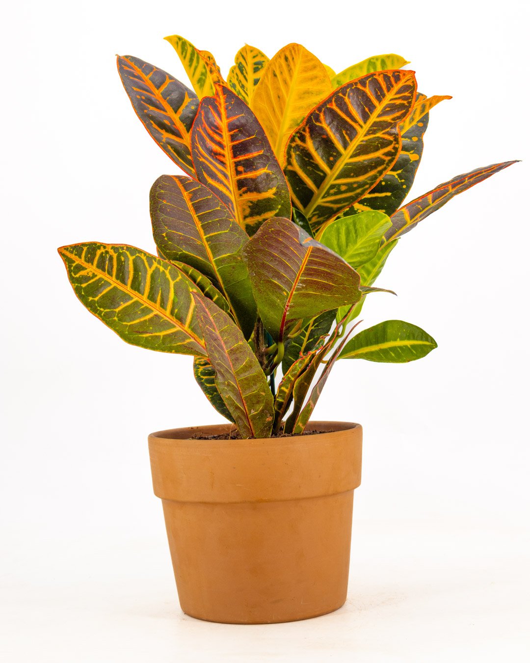 Il croton ‘Petra’ è una delle piante d’appartamento più spettacolari grazie al suo fogliame multicolore. Le sue foglie grandi, coriacee e lucide sono un mosaico naturale di verde, giallo, arancione e rosso intenso, con venature marcate che sembrano dipinte a mano.