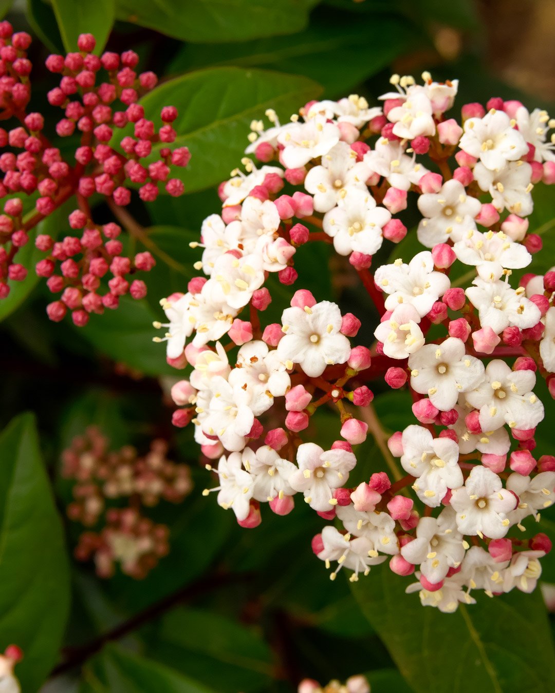 Il viburnum tinus ‘Spirit’ è un arbusto sempreverde compatto, con foglie verde scuro e lucenti e mazzetti di fiori bianco-rosati che sbocciano da dicembre ad aprile.